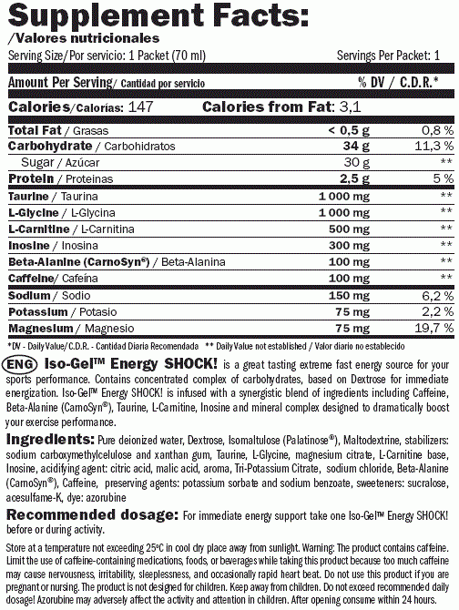 Iso-Gel® Energy Shock también contiene una mezcla sinergítica de compuestos como la taurina, la L-glicina, la L-carnitina, la Inosina, la Beta alanina CarnoSyn®, la cafeína y un complejo mineral para potenciar espectacularmente la concentración mental y el rendimiento durante el entrenamiento.