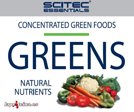 Greens de Scitec Essentials es una fórmula de multivitamínica y mineral, que además contiene unas efectivas mezclas patentadas de ingredientes de origen natural como enzimas, probióticos, aceites vegetales, extractos de vegetales, extractos herbales, extractos de verduras, extractos de frutas y extractos de setas.