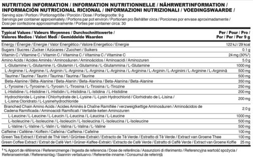Mezcla de aminoácidos (L-glutamina, L-leucina, taurina, L-arginina, L-isoleucina, L-valina, beta-alanina, L-tirosina, L-histidina, clorhidrato de L-lisina, emulgente: lecitina de girasol), acidulantes (ácido cítrico, ácido málico, ácido L(+)-tartárico), aroma, colorantes (beta-caroteno, curcumina, rojo de remolacha), inulina, edulcorantes (sucralosa, acesulfamo K), espesantes (carboximetilcelulosa sódica, goma xantana, carragenanos), antiaglomerantes (dióxido de silicio, silicato cálcico), extracto de té verde (Camellia sinensis, hoja), cafeína natural, ácido L-ascórbico, extracto de café verde (Coffea arabica L., fruto).