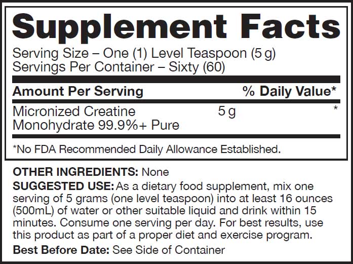 Creatina monohidrato con un 99,9% de pureza que ha sido micronizada para garantizar una disolución instantánea en agua u otros líquidos.