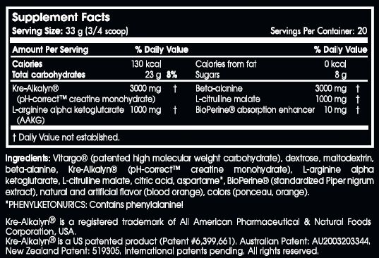 Vitargo® (hidrato de carbono patentado de gran peso molecular), dextrosa, maltodextrina, beta-alanina, Kre-Alkalyn® (monohidrato de creatina pH-korrekt™), L-arginina alfa cetoglutarato, L-citrulina malato, ácido cítrico, aspartamo*, BioPerine® (extracto de Piper nigrum estandarizado), aromas naturales y artificiales (frutos del bosque, frambuesa aromas), color (carmosin, azul).
