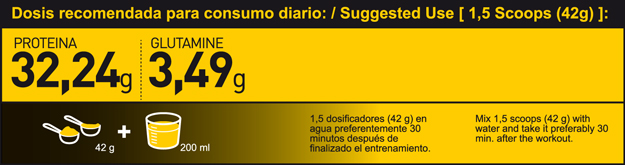 Mezclar 1,5 dosificadores (42 gramos) en aproximadamente 200 ml de agua, preferiblemente 30 minutos después de finalizado el entrenamiento.