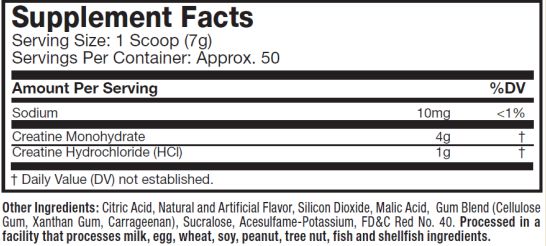 Creatina monohidrato, creatina clorhidrato (HCl), ácido cítrico, aromas naturales y artificiales, dióxido de silicio, ácido málico, mezcla de gomas (goma de celulosa, goma xantana, carragenina), sucralosa, acesulfamo de potasio, FD & C Red No. 40.
