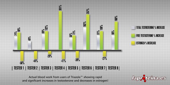 Hemos llevado a cabo numerosos estudios de los análisis de sangre en usuarios de Triazole™ para demostrar su efectividad reduciendo los niveles de estrógeno y aumentando los niveles de testosterona. Uno de ellos mostró un incremento del 120% de la testosterona total y un aumento del 257% de la testosterona libre. ¿Conoces algo parecido y legal al mismo tiempo?