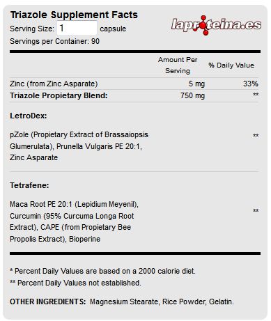 Zinc (como aspartato de zinc), mezcla patentada LetroDex (extracto de raíz de Maca (Lepidium Meyenii), extracto de Brassaiopsis Glomerulata (Hoja) (pZole), extracto de Prunella Vulgaris (Planta entera), extracto de cúrcuma (Curcuma Longa) (raíz), extracto de propóleos de abeja, extracto de pimienta negra (Piper Nigrum) (Fruta) (BioPerine).