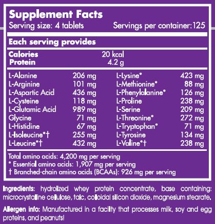 Amino 5600 es una fuente de aminoácidos puros hidrolizados en comprimidos de 1.050 mg de proteína de suero hidrolizada.
