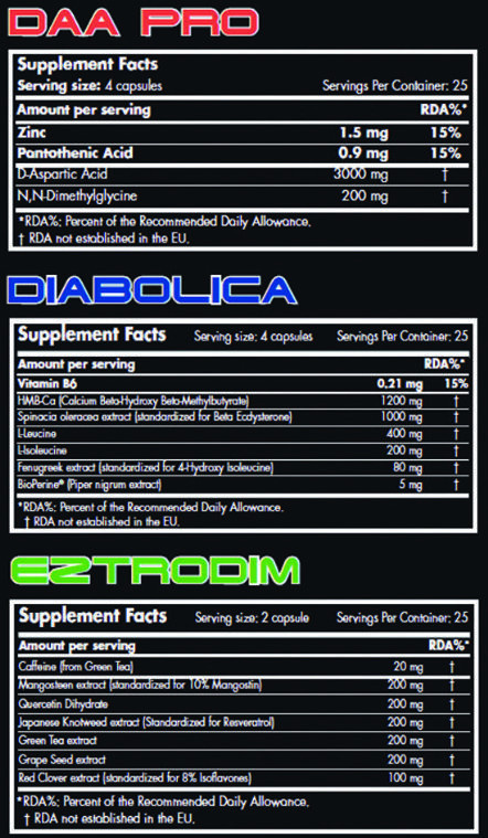 Diabolica: Monohidrato de calcio beta-hidroxi-beta-metilbutirato, extracto de Spinacia oleracea (hoja) 5%, gelatina bovina, L-leucina, L-isoleucina, antiaglomerante (estearato de magnesio), extracto de Trigonella foenum-graecum (semillas) 20%, colorantes (dióxido de titanio, óxido negro de hierro, negro brillante BN), BioPerine® (extracto de fruto de Piper nigrum 50:1), piridoxina clorhidrato (vitamina B6).