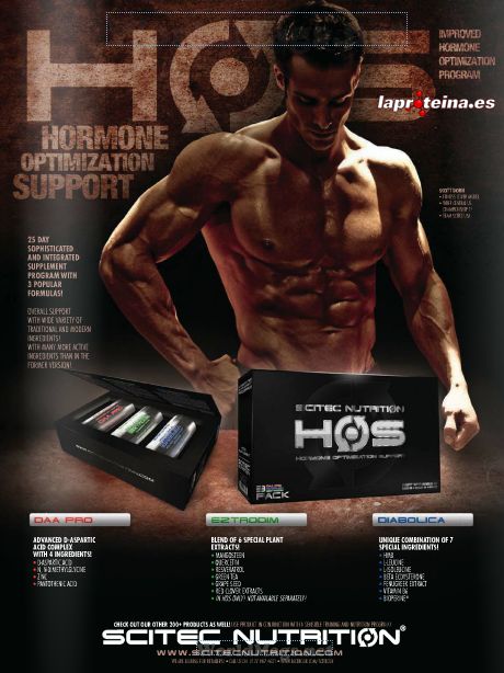 HOS de Scitec Nutrition es el sistema optimizador hormonal más potente del mercado que maximiza el funcionamiento hormonal de tu organismo, a la vez que se ponen en marcha de un modo espectacular todos los procesos de construcción muscular y de conservación de la musculatura.