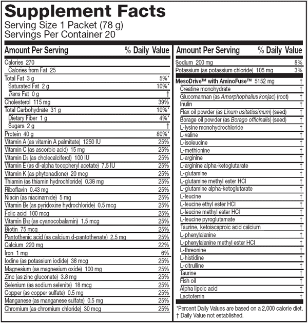 La fórmula de Meso-Tech ha sido supercargada con un complejo anabólico que contiene proteínas de calidad superior y una dosis exacta de aminoácidos, ya que ha sido desarrollada para hacer lo que ningún otro sustitutivo de comida puede: ayudarle a crear nuevo músculo rápidamente.