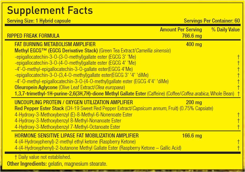 Los "compuestos híbridos lipolíticos", es un término acuñado para definir un compuesto derivado de la naturaleza que ha sido alterado por procesos naturales sintetizados para producir efectos más potentes. La fórmula de Ripped Freak™ combina específicamente los ingredientes clave para la quema de grasa con el éster galato de metilo, que se utiliza en la industria para ofrecer una biodisponibilidad superior y una prolongada vida media en el cuerpo.