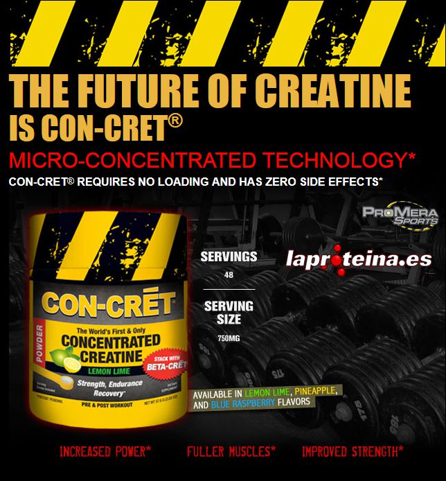 Concentrated Creatine de Con-Cret de la marca ProMera Sports es “creatina concentrada”, que según los diversos estudios realizados resulta ser 59 veces más potente que la creatina estándar.