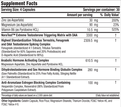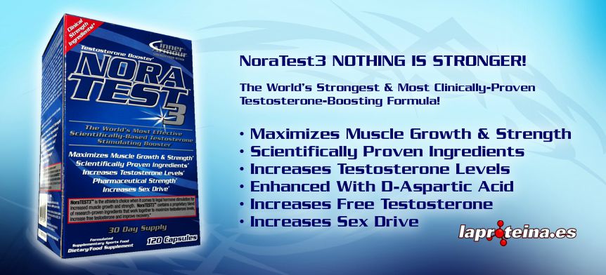 La fórmula de NoraTEST3 contiene el poderoso complejo Highest standardization Tribulus Terrestris, Fenugreek and DAA testosterone Spiking Complex científicamente diseñado para incrementar de forma natural la secreción de la testosterona, la hormona más poderosa para la construcción muscular.