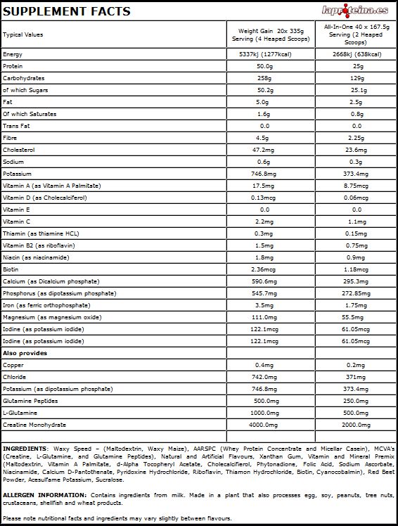 Waxy Speed™ (maltodextrina, maíz ceroso), Precision Pro™: Amino Acid Ratio Specific Protein Complex (concentrado de proteína de suero y caseína micelar), MCVA´S (creatina, L-glutamina y Péptidos de Glutamina), sabores naturales y artificiales, goma xantana, vitaminas y premezclas minerales (maltodextrina, vitamina A palmitato, acetato di-alfa tocoferol, Colecalcifierol, fitonadiona, ácido fólico, ascorbato sódico, niacinamida, calcio D-pantotenato clorhidrato, piridoxina, riboflavina, clorhidrato de tiamina, biotina, Cianocobalamina), remolacha roja en polvo, acesulfame potásico, sucralosa.