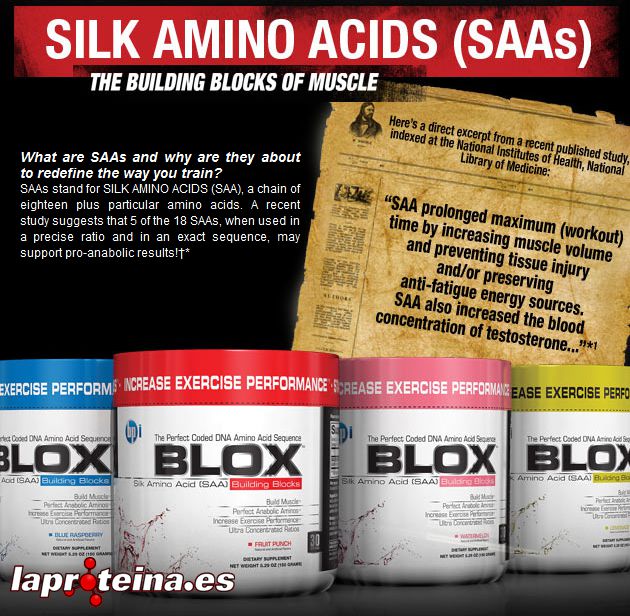 Blox de BPI Sports es un suplemento de aminoácidos de seda (denominados en inglés Silk Amino Acids - SAAs).