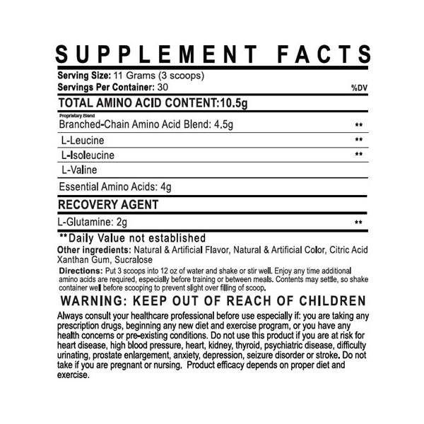 Gracias a su lograda composición BC+EAA es un producto muy completo y de calidad superior, diseñado para mejorar la recuperación, evitar el catabolismo muscular e iniciar el anabolismo.