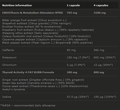 Cloruro de potasio, extracto de raíz de jengibre (Zingiber officinale Rosc.), Cafeína, extracto de Evodiae fructus, extracto de naranja amarga fruta (Citrus aurantium L.), extracto de sauce llorón (Salix sepulcralis), extracto de frambuesa fruta (Rubus idaeus L.), Coleus forskohlii extracto de la raíz, extracto de pomelo (Citrus grandis), extracto de semilla de cacao (Theobroma cacao L.), extracto de hojas de té verde (Camellia sinensis L.), la acetil-L-tirosina, extracto de pimienta de Cayena (Capsicum annuum L.), negro extracto de pimienta (Piper nigrum L.) Bioperine ®; yoduro de potasio, cromo (III) cloruro, agente de carga - celulosa microcristalina, antiaglomerante - estearato de magnesio, cápsula (gelatina, color: E 171).