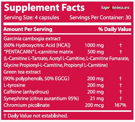 Extracto de Garcinia Cambogia (60% Ácido hidroxicitrico [HCA]), PENTACARN matriz de carnitina (L-Carnitina L-Tartrato, Acetil L-Carnitina, L-Carnitina Fumarato, Glicina Propionil-L-Carnitina, Propionil-L-Carnitina), Extracto de té verde [90% polyphenols, 50% EGCG], L-tirosina, Cafeína anhydrous, Sinefrina (citrus aurantium 95%), Picolinato de cromo, estearato de magnesio, gelatina (cápsulas).