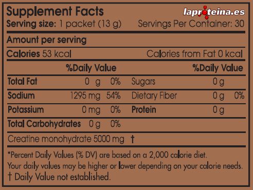 Monohidrato de creatina, acidulante (ácido cítrico anhidro), carbonato de sodio, carbonato ácido de sodio, aroma (limón), ácido ascórbico, edulcorante artificial (aspartamo), colorante (riboflavina).