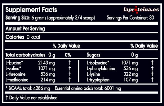 - L-leucina (2143 mg): aminoácido esencial de características muy energéticas en el ámbito del músculo. Tiene una disponibilidad muy alta.