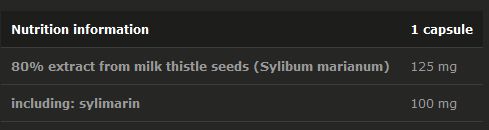 Extracto de semillas de cardo de leche, celulosa microcristalina - relleno, estearato de magnesio - antiaglomerante, cápsula (gelatina - ingrediente recubrimiento, color: E171.