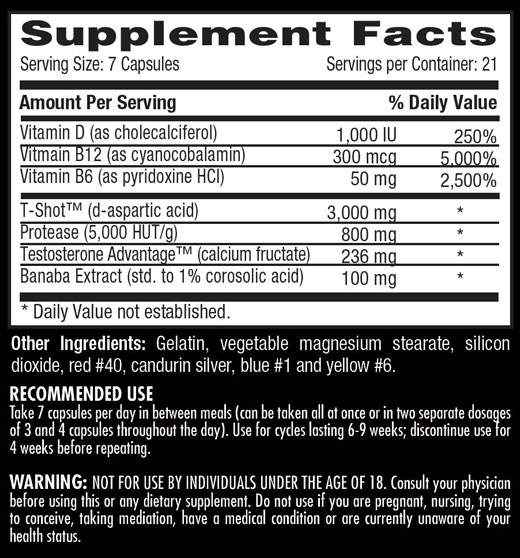 T-Shot™ ácido D-aspártico (DAA): Este aminoácido de origen natural eleva los niveles de testosterona a partir de 12 días. Adaptodren™ contiene la misma dosis que se utilizó en los estudios clínicos. Las nuevas investigaciones sugieren que el ácido D-aspártico es el más potente aminoácido para el aumento de la testosterona de la industria de los suplementos.