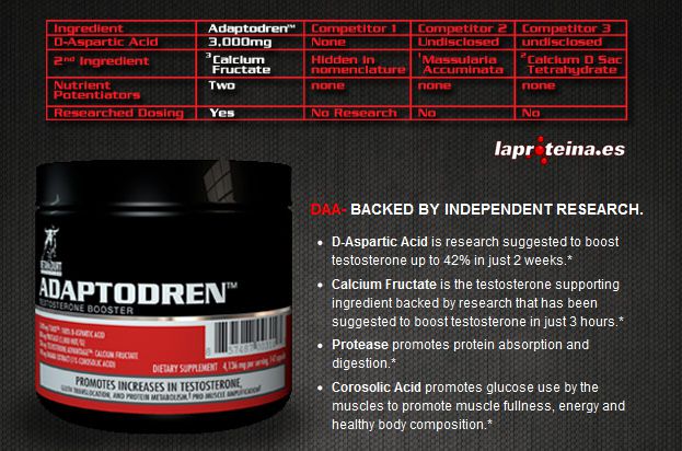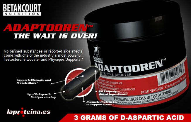 Adaptodren™ es el nuevo potenciador de la testosterona de la marca USA Betancourt Nutrition cuyos ingredientes han sido probados en diferentes investigaciones, y que es capaz de elevar la testosterona en tan sólo tres horas gracias al calcio fructato, y que contiene además el poderoso ácido D-aspártico que es capaz de elevar la testosterona hasta en un 42% en tan sólo 2 semanas.