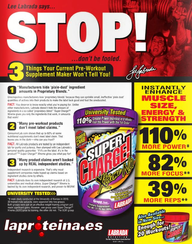 ¡No lo dudes, con Super Charge!® Xtreme N.O. de Labrada Nutrition sentirás una super carga de óxido nítrico sólo 15 mínutos después de su toma!