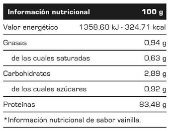 Caseína micelar, L-Glutamina (Ajinomoto®), L-Glicina, cacao en polvo (según sabor), aroma: según sabor y edulcorante: sucralosa.