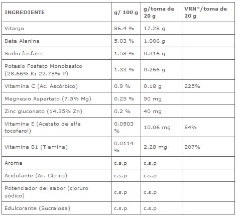 Vitargo* (Almidón de cebada), Beta Alanina, Aroma, Acidulante (Ácido cítrico), Fosfato sódico, Fosfato potásico, Cloruro sódico, Ácido ascórbico (Vitamina C), Edulcorante (Sucralosa), Aspartato de magnesio, Gluconato de zinc, Acetato de alfatocoferol (Vitamina E), Clorhidrato de tiamina (Vitamina B1).