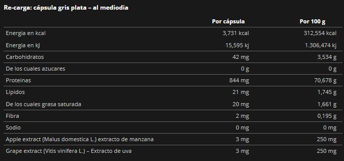 Beta alanina, malato de citrulina, cápsula: gelatina, extracto de manzana (Malus domestica L.), extracto de uva, fruta entera (Vitis vinifera L.), agente anticoagulante: estearato de magnesio, colorante: candurin plata fina; anticoagulante: dióxido de silicio, colorante: óxido de hierro negro.