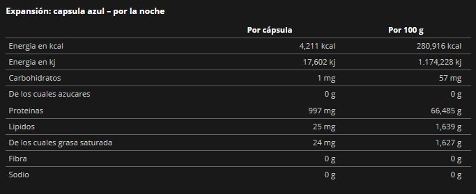 - Una hora antes del entrenamiento o antes de la cena (los días de descanso) tomar 3 cápsulas azules.
