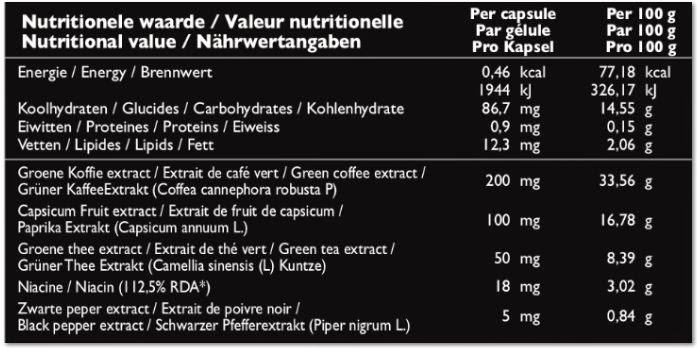 Extracto de café verde (Coffea canephora P. robusta), de relleno; celulosa microcristalina; extracto de fruta granulada de Capsicum (Capsimax®) (Capsicum annuum L.); plataforma cápsula: Celulosa; extracto de té verde (Camellia sinensis (L) Kuntze), niacina, extracto de pimienta negra (Piper nigrum L.), colorantes agente anti coagulación: estearato de magnesio, dióxido de silicio, óxido de hierro, potasio silicilato aluminio, dióxido de titanio.