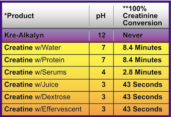 La creatina monohidrato convencional mezclada con líquido tarda entre 10 y 15 minutos en convertirse en creatinina y por lo tanto deja de ser útil como suplemento para el deportista.