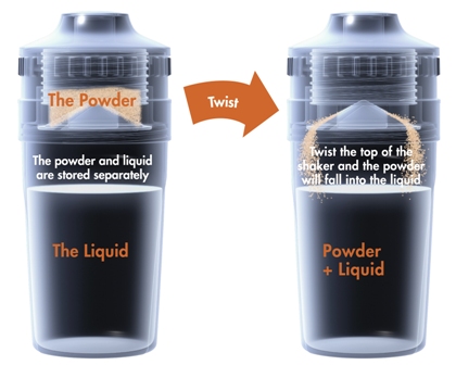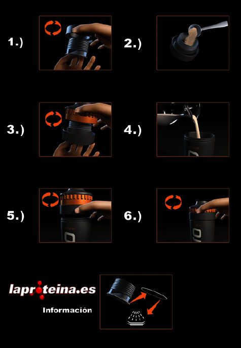 Consiste en una coctelera o shaker que mantiene por separado el polvo del batido y el líquido, de modo que los mezclas en el momento de tomártelo, no antes.