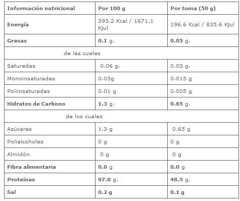 - Tiene un 97% de porcentaje proteico, muy baja en grasa y carbohidratos.