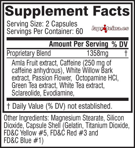 No utilice si está embarazada o amamantando. Este producto sólo está destinado a ser consumido por adultos sanos de 18 años de edad o más. Antes de usar este producto consulte a su médico si está utilizando cualquier medicamento o incluso si tiene alguna condición médica pre-existente, pero no limitada a: la presión arterial alta o baja, arritmia cardíaca, accidente cerebrovascular, corazón, hígado, enfermedad del riñón o la tiroides, epilepsia, enfermedad psiquiátrica, diabetes, dificultad para orinar debido al agrandamiento de la próstata o si está tomando un IMAO (inhibidor de la monoaminooxidasa) o cualquier otro medicamento. Suspenda su uso y consulte a su profesional de la salud si experimenta alguna reacción adversa a este producto.