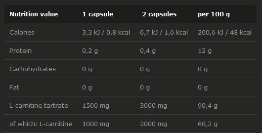 98% de L-carnitina tartrato, agente de carga - celulosa microcristalina, antiaglomerante - estearato de magnesio, cápsula (gelatina, color: E171).