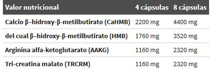 41,7% calcio β-hidroxy-β-metilbutirato, 22% L-arginina alfa-ketoglutarato, 22% tri-creatina malato, agente anti-apelmazante - estearato de magnesio; cápsula (gelatina, colorante: E171).