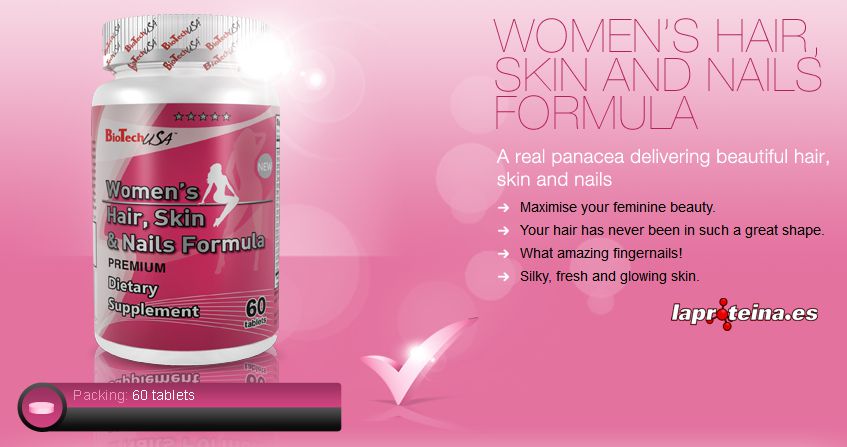 Fórmula para el cuidado de la piel, el cabello y la uñas de la mujer.