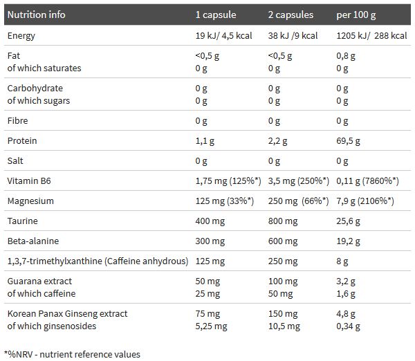 21,1% taurina, 19,2% L-tirosina, 13,4% beta-alanina, óxido de magnesio, cafeína anhídrida, extracto de guaraná (Paullinia cupana Kunth., 22% cafeína), extracto de Korean Panax ginseng, hidrocloruro de piridoxina – vitamina B6, agente espesante – celulosa microcristalina, agente anti-apelmazante – estearato de magnesio, cápsula (gelatina, colorante: E 171).