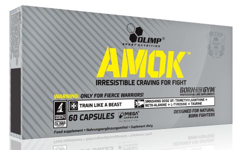 Amok™ de Olimp® Sport Nutrition es un suplemento en cápsulas de preentrenamiento que contiene unas dosis elevadas de cafeína para incrementar el rendimiento y reducir el cansancio. También contiene otros ingredientes que elevan los niveles de energía como el extracto de ginseng coreano, el guaraná, la beta-alanina o la vitamina B6.