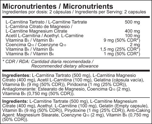 Exclusiva combinación de carnitina y cofactores (vitaminas B3, B5, B6 y coenzima 10) que favorecen la obtención de energía de la grasa almacenada.
