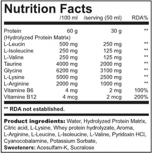 Proteína hidrolizada para utilizar durante el entrenamiento. 30 gramos de proteína, 0 de grasa y 0 de carbohidratos.