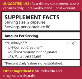 Tomar 2 cápsulas de Kre-Alkalyn EFX al día solamente los días de entrenamiento, preferiblemente con el estómago vacio.