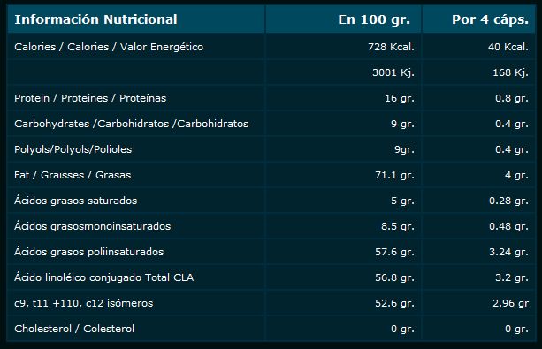 Tiene una concentración muy alta de ácidos grasos beneficiosos activos CLA, denominados isómeros. Una dosis diaria de 3 gramos al día de estos isómeros activos resulta óptima para modelar su figura.