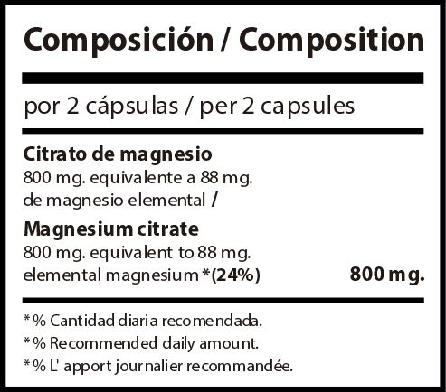 Citrato de magnesio, estearato de magnesio y gelatina (cápsula).