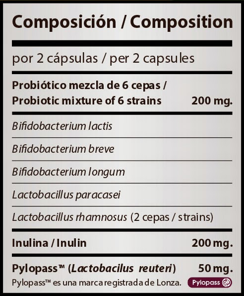 Probiótico (Lactobacillus rhamnosus, Lactobacillus paracasei, Lactobacillus acidophilus, Bifidobacterium longum, Bifidobacterium breve, Bifidobacterium lactis) (Dupont™), inulina, espesante (cápsula): hidroxipropilmetilcelulosa, Lactobacillus reuteri (Pylopass™) y antiaglomerantes: dióxido de silicio y estearato de magnesio.