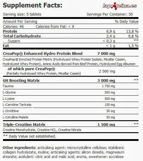 Proteína de suero de leche hidrolizada, CreaPep® - péptidos de proteína de suero de leche parcialmente hidrolizado - contiene lecitina de soja, aminoácidos derivados de proteína de ternera, albúmina de huevo hidrolizada, taurina, monohidrato de creatina, caseína micelar de leche, L-glicina, L-lisina, creatina HCl, nitrato de creatina, tartrato de L-carnitina, L-ornitina, L-citrulina malato, antiaglomerante: celulosa microcristalina; estabilizadores: hidrolizado de colágeno, inulina; antiaglomerante: estearato de magnesio, dióxido de silicio; agentes acidulantes: ácido cítrico, ácido málico; aroma, edulcorante: sucralosa.