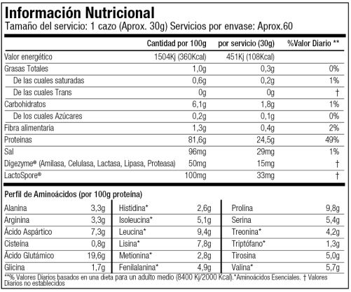 Caseína micelar (aislado de proteína de leche), Aminogen®, Digezyme® (Amilasa, Celulasa, Lactasa, Lipasa, Proteasa neutra), LactoSpore® probióticos, goma guar, edulcorante (sucralosa E955)).
