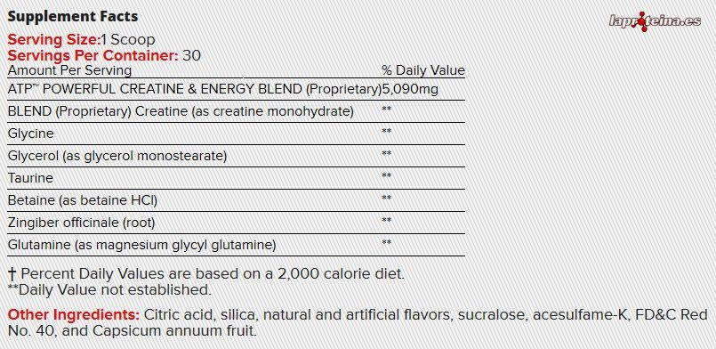 ATP™ es una fórmula de construcción muscular monumental. El ingrediente principal de la fórmula de ATP™ es el monohidrato de creatina. Este ingrediente ha sido estudiado y sus efectos probados en múltiples investigaciones y posiblemente se trate del suplemento más utilizado y efectivo de la nutrición deportiva junto con los suplementos de proteínas. La creatina es esencial para cualquier culturista o atleta que desee mejorar su musculatura, fuerza y/o orendimiento, ya que se distribuye ampliamente en el músculo esquelético y suministra energía a las células por medio del aumento de trifosfato de adenosina (ATP).